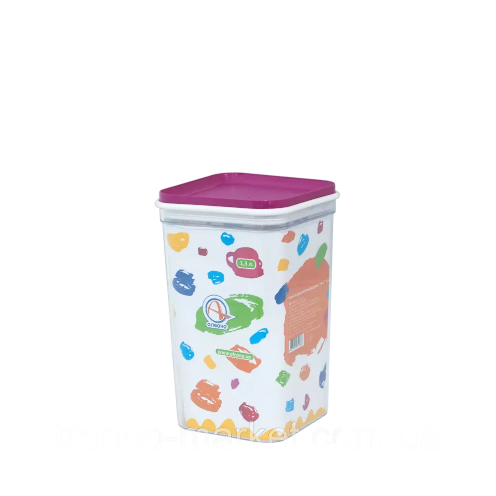Емкость для сыпучих продуктов "Фикс" 1,3л., Артикул 169059, параметры изделия : линейные размеры ,мм : 110 х 110 х 190, объем - 1,3 л; кол-во в упаковке: 25 шт. Цвета в ассортименте :_пр./бірюзова,_пр./кремова,_пр./оливкова,_пр./світло-оранжева,_пр./темно-рожева.