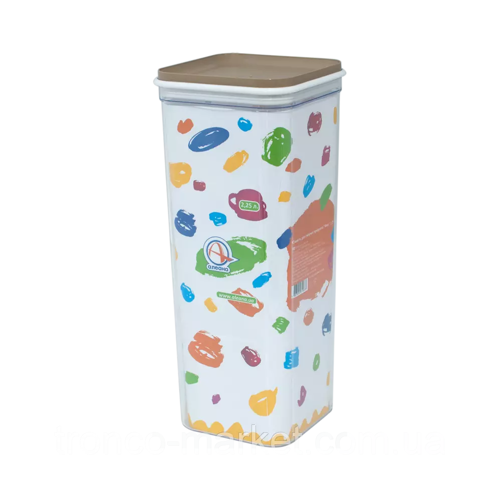 Емкость для сыпучих продуктов "Фикс" 2,25л., Артикул 169060, параметры изделия : линейные размеры ,мм : 110 х 110 х 280, объем - 2,25 л; кол-во в упаковке: 25 шт. Цвета в ассортименте :_пр./бірюзова,_пр./кремова,_пр./оливкова,_пр./світло-оранжева,_пр./темно-рожева.