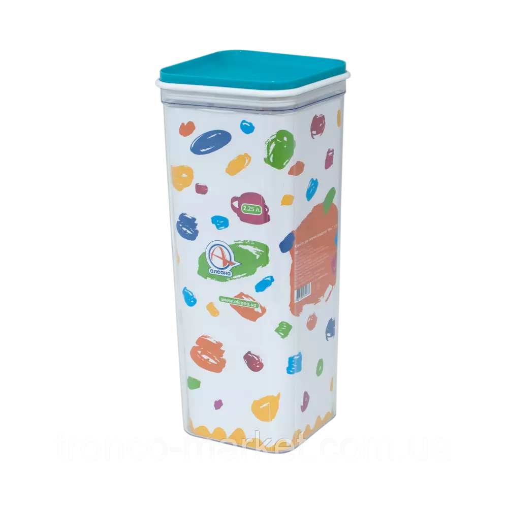 Емкость для сыпучих продуктов "Фикс" 2,25л., Артикул 169060, параметры изделия : линейные размеры ,мм : 110 х 110 х 280, объем - 2,25 л; кол-во в упаковке: 25 шт. Цвета в ассортименте :_пр./бірюзова,_пр./кремова,_пр./оливкова,_пр./світло-оранжева,_пр./темно-рожева.