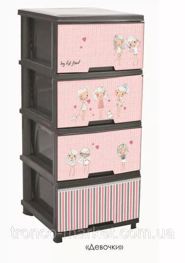 Новинка от украинского производителя АЛЕАНА - комод на четыре ящика с декором. Комод (фр. commode — «удобный») — предмет французской мебели с выдвижными ящиками для хранения одежды. Разработан с целью помочь вам грамотно организовать хранение вещей в вашем доме. ?зготовлен из качественного полипропилена, удобный и вместительный. ?спользуется как дополнение к основной мебели и к туалетному столику. В нем можно хранить хранить ювелирные украшения, косметику и другие необходимые вещи. Оптимально подобранный размер : высота 95,5 см, ширина 39,5 см, глубина 46,5 см , разнообразный декор и изысканные цвета на любой, даже самый требовательный вкус с легкостью впишется в любой интерьер. Для любителей классики подойдет - Ротанг или Дерево, для романтических натур - Париж или Лаванда, для маленьких девочек - Совы, Медведи,Девочки, для мальчиков -Ралли,Совы, Медведи. Каждыйнайдет для себя красивый дизайн. Правильно организованное хранение,при этом еще и радущее глаз гарантирует порядок в доме и в мыслях. Проверьте на себе! :)