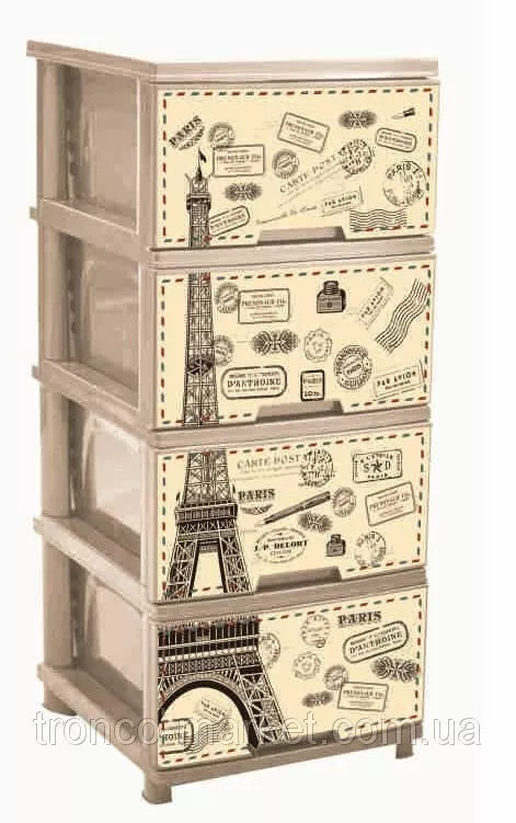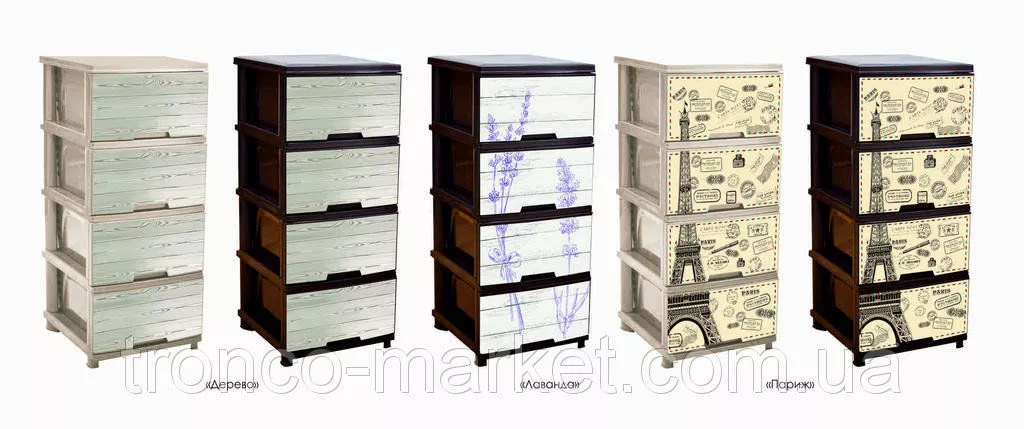 Новинка от украинского производителя АЛЕАНА - комод на четыре ящика с декором. Комод (фр. commode — «удобный») — предмет французской мебели с выдвижными ящиками для хранения одежды. Разработан с целью помочь вам грамотно организовать хранение вещей в вашем доме. ?зготовлен из качественного полипропилена, удобный и вместительный. ?спользуется как дополнение к основной мебели и к туалетному столику. В нем можно хранить хранить ювелирные украшения, косметику и другие необходимые вещи. Оптимально подобранный размер : высота 95,5 см, ширина 39,5 см, глубина 46,5 см , разнообразный декор и изысканные цвета на любой, даже самый требовательный вкус с легкостью впишется в любой интерьер. Для любителей классики подойдет - Ротанг или Дерево, для романтических натур - Париж или Лаванда, для маленьких девочек - Совы, Медведи,Девочки, для мальчиков -Ралли,Совы, Медведи. Каждыйнайдет для себя красивый дизайн. Правильно организованное хранение,при этом еще и радущее глаз гарантирует порядок в доме и в мыслях. Проверьте на себе! :)