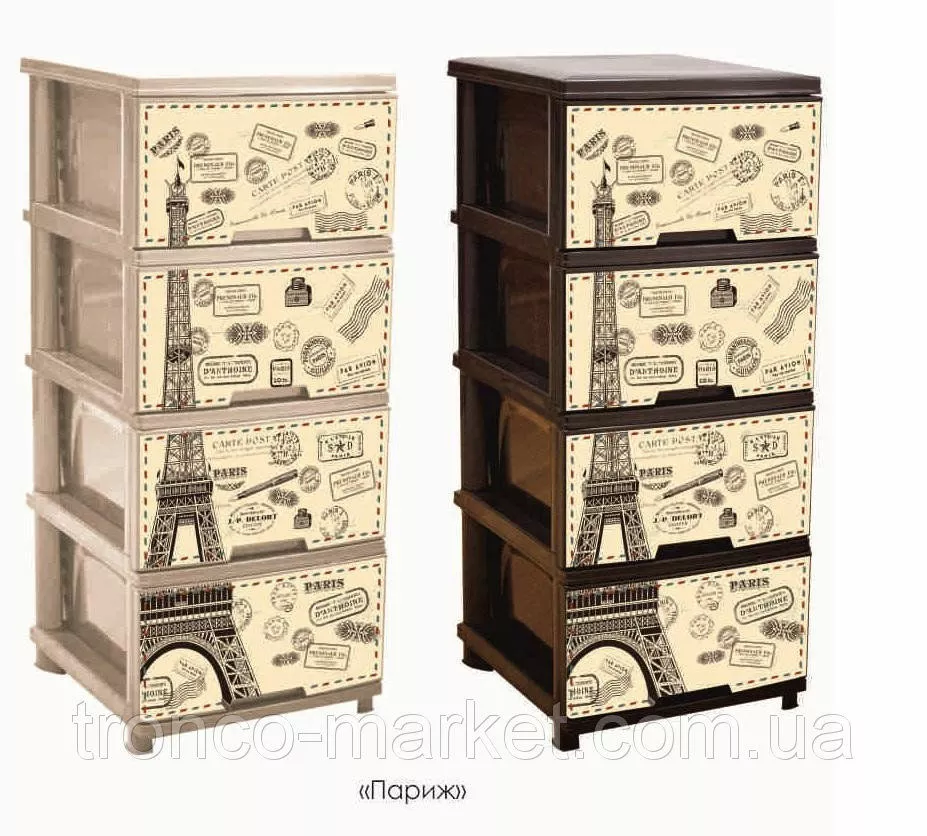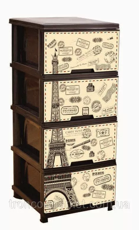 Новинка от украинского производителя АЛЕАНА - комод на четыре ящика с декором. Комод (фр. commode — «удобный») — предмет французской мебели с выдвижными ящиками для хранения одежды. Разработан с целью помочь вам грамотно организовать хранение вещей в вашем доме. ?зготовлен из качественного полипропилена, удобный и вместительный. ?спользуется как дополнение к основной мебели и к туалетному столику. В нем можно хранить хранить ювелирные украшения, косметику и другие необходимые вещи. Оптимально подобранный размер : высота 95,5 см, ширина 39,5 см, глубина 46,5 см , разнообразный декор и изысканные цвета на любой, даже самый требовательный вкус с легкостью впишется в любой интерьер. Для любителей классики подойдет - Ротанг или Дерево, для романтических натур - Париж или Лаванда, для маленьких девочек - Совы, Медведи,Девочки, для мальчиков -Ралли,Совы, Медведи. Каждыйнайдет для себя красивый дизайн. Правильно организованное хранение,при этом еще и радущее глаз гарантирует порядок в доме и в мыслях. Проверьте на себе! :)