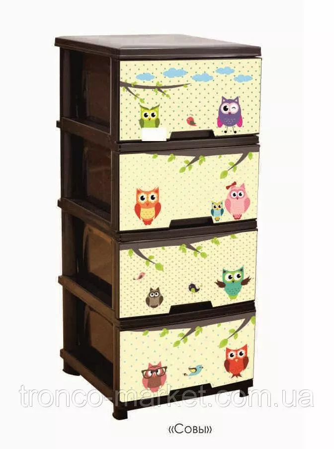 Новинка от украинского производителя АЛЕАНА - комод на четыре ящика с декором. Комод (фр. commode — «удобный») — предмет французской мебели с выдвижными ящиками для хранения одежды. Разработан с целью помочь вам грамотно организовать хранение вещей в вашем доме. ?зготовлен из качественного полипропилена, удобный и вместительный. ?спользуется как дополнение к основной мебели и к туалетному столику. В нем можно хранить хранить ювелирные украшения, косметику и другие необходимые вещи. Оптимально подобранный размер : высота 95,5 см, ширина 39,5 см, глубина 46,5 см , разнообразный декор и изысканные цвета на любой, даже самый требовательный вкус с легкостью впишется в любой интерьер. Для любителей классики подойдет - Ротанг или Дерево, для романтических натур - Париж или Лаванда, для маленьких девочек - Совы, Медведи,Девочки, для мальчиков -Ралли,Совы, Медведи. Каждыйнайдет для себя красивый дизайн. Правильно организованное хранение,при этом еще и радущее глаз гарантирует порядок в доме и в мыслях. Проверьте на себе! :)