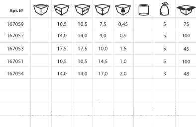 105 х 105 х 75, объем -0,45; кол-во в упаковке: 5 шт. Цвета